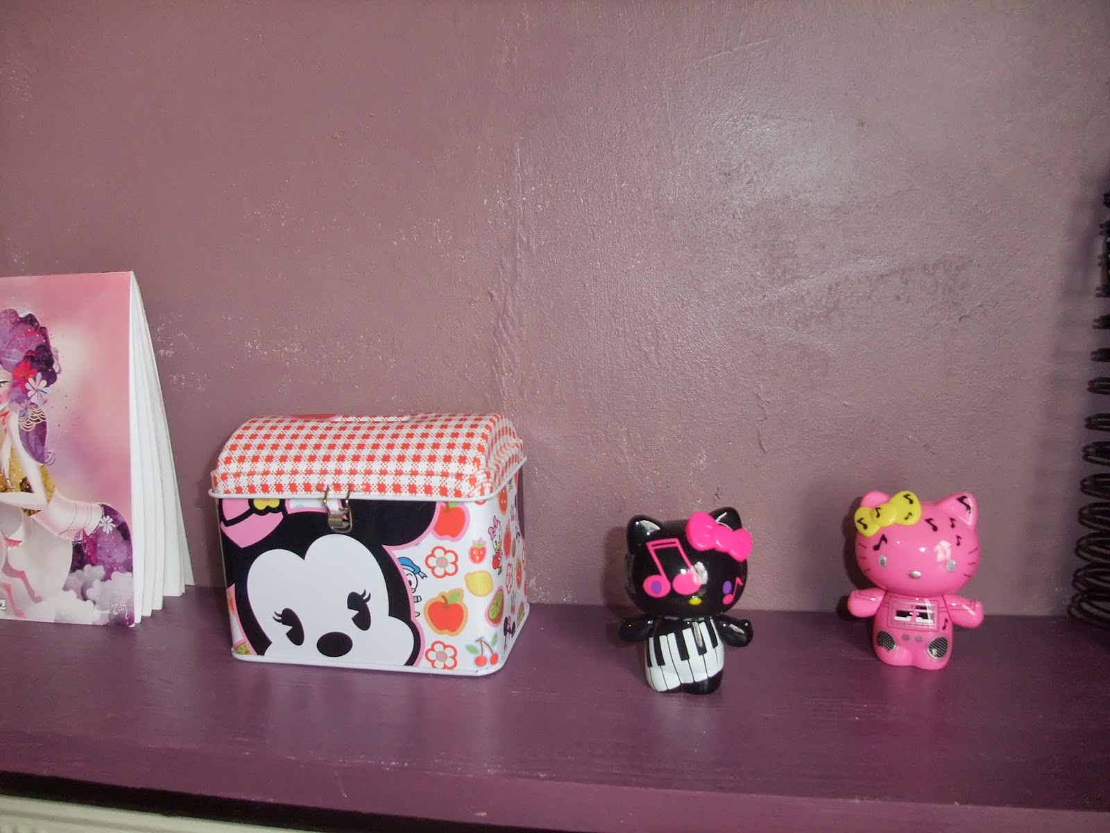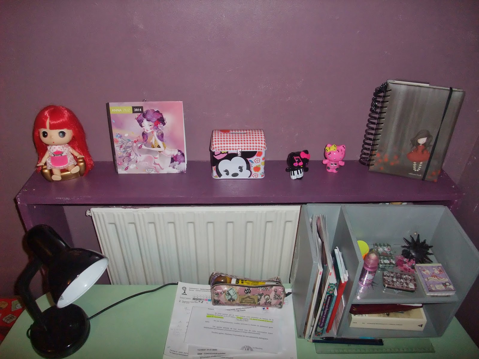 Sur l'étagère cache radiateur au-dessus de mon bureau, idéal pour exposer de la déco, j'ai opté pour des kawaiieries représentatives de mon univers: Les illustrateurs, les doll jap, les objets HK et Disney originaux.