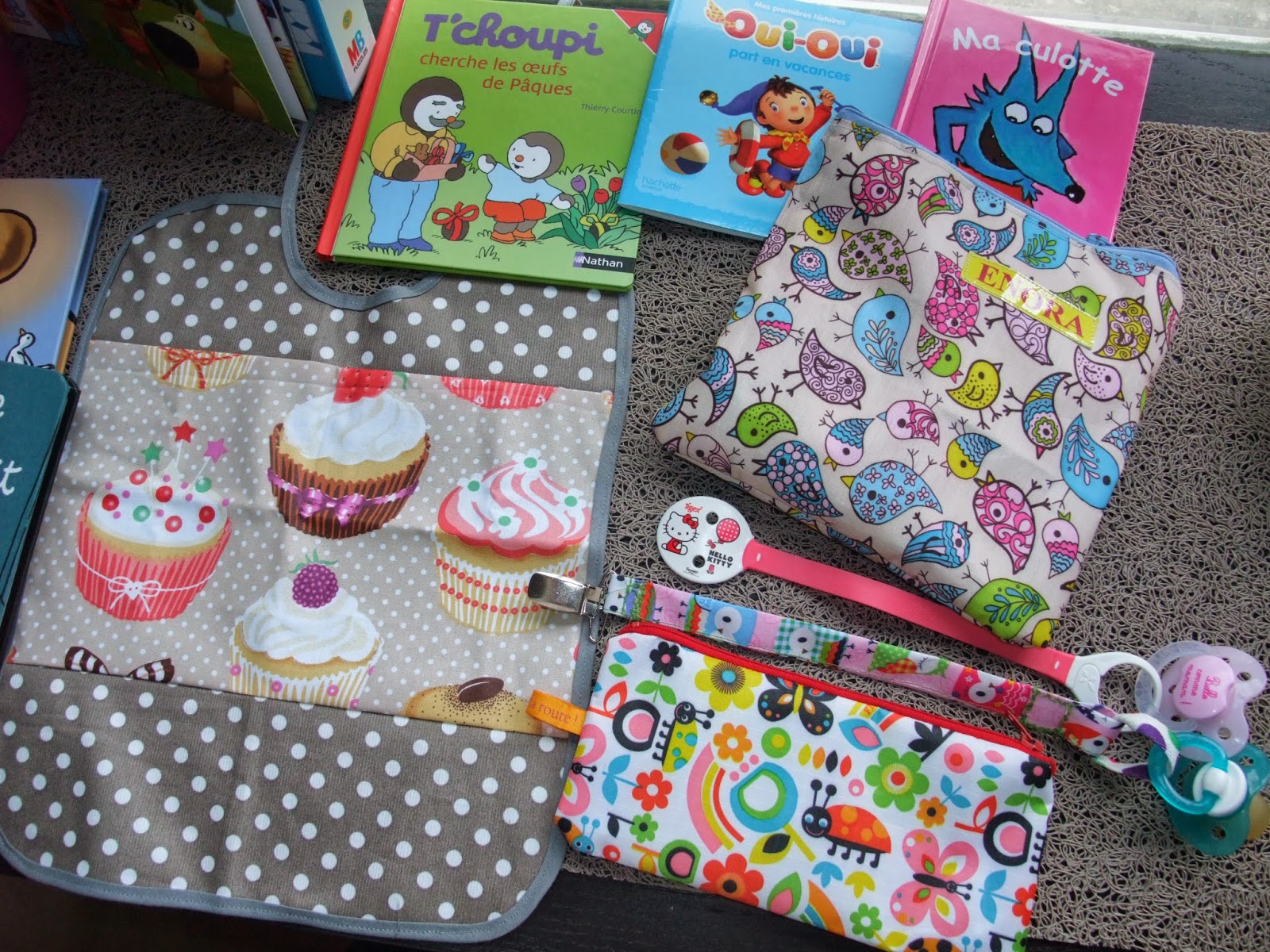 Des livres, des trousses, bavoir, porte tototte...