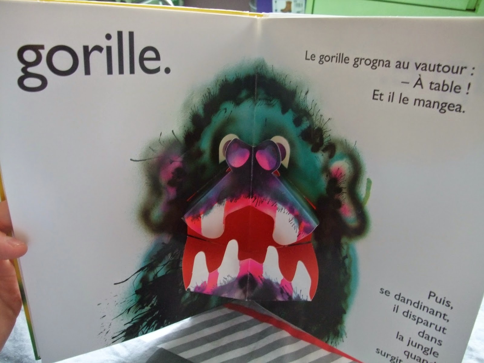 A table ! Un livre pop up, d'animaux prédateurs, lorsqu'on bouge le livre la gueule de l'animal s'ouvre et se referme, on peut mettre le doigt dans la gueule des animaux et surtout du crocodile!!