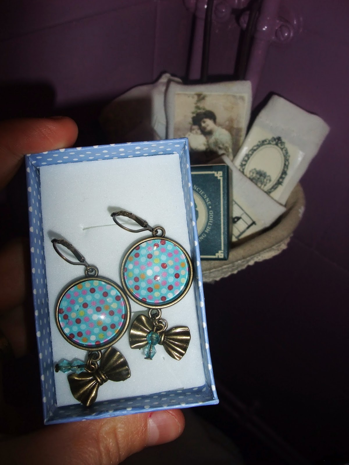 Sautoir et boucles d'oreilles de la créatrice "Julie et Risson" offerts par ma belle soeur et mon frère. J'étais dingue en ouvrant ce 1er paquet, le sautoir à plein de détails <3 Totalement mon style : bleu ciel à pois (comme mon sac!)