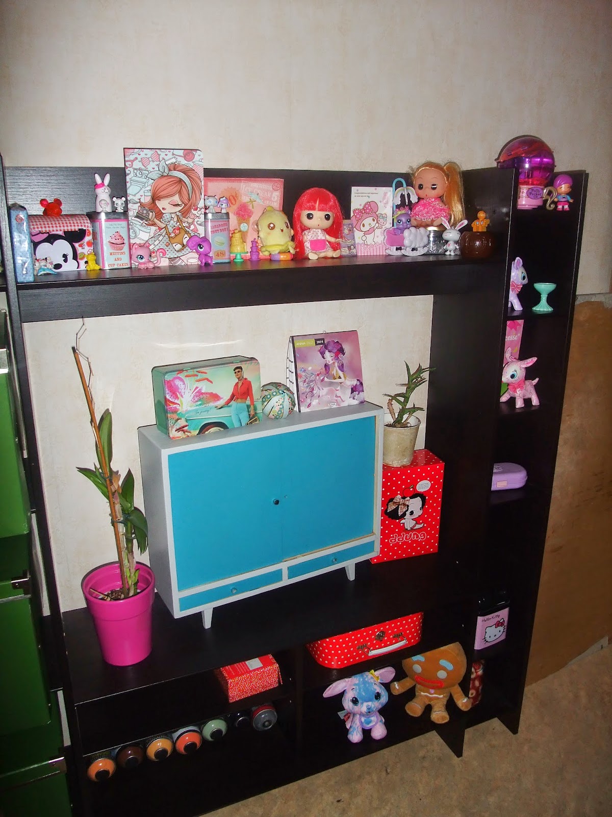 Depuis 2 mois nous avons retiré la tv du meuble que l'on avait avant, chéri ne l'aimait plus. J'ai sauté sur l'occasion pour en faire un meubles à bidouilles girly kawaii plutôt que de le basarder ! J'imaginais là enfin un endroit où exposer mon armoire à poupée qui traine ci et là de l'appartement sans être mis en valeur...