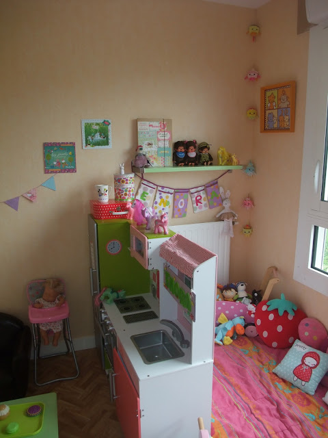 Je n'arrete pas de faire des changements dans sa chambre, voici les dernieres photos avec la guirlande hello kitty que je viens juste de réaliser, elle provient du magasine du même nom (et qui est sur mon bureau depuis trèèès longtemps dans l'attente d'être montée)